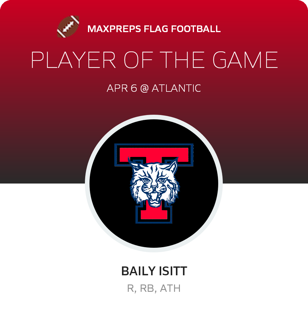Congratulations to #3 Baily Isitt for being selected the Taylor Girls Flag Football Player of the Game.