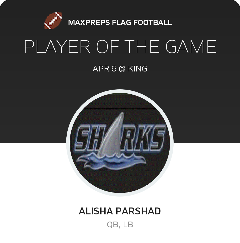 Congratulations to #12 Alisha Parshad for being selected the Riverview Girls Flag Football Player of the Game.