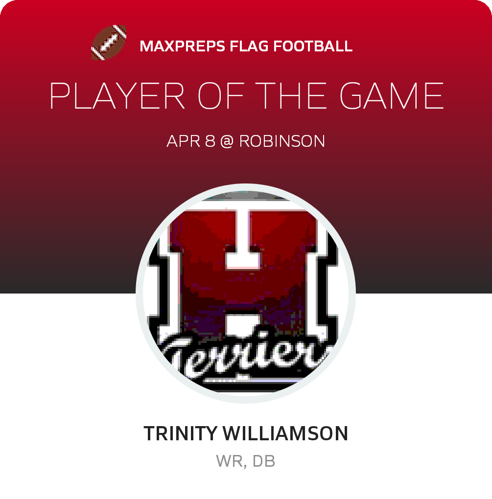 Congratulations to #10 Trinity Williamson for being selected the Hillsborough Girls Flag Football Player of the Game.