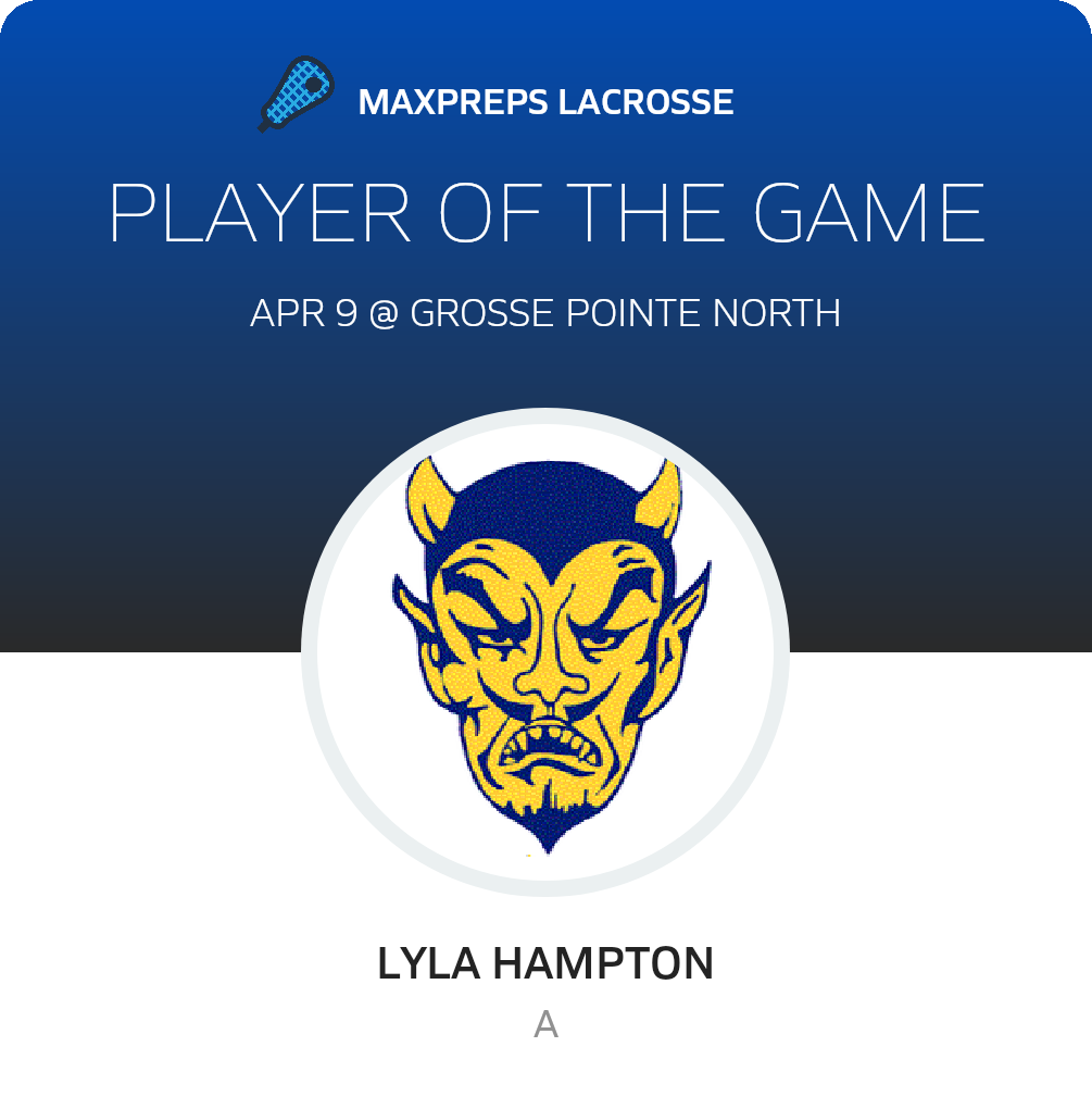 Congratulations to #32 Lyla Hampton for being selected the Grosse Pointe South Girls Lacrosse Player of the Game.