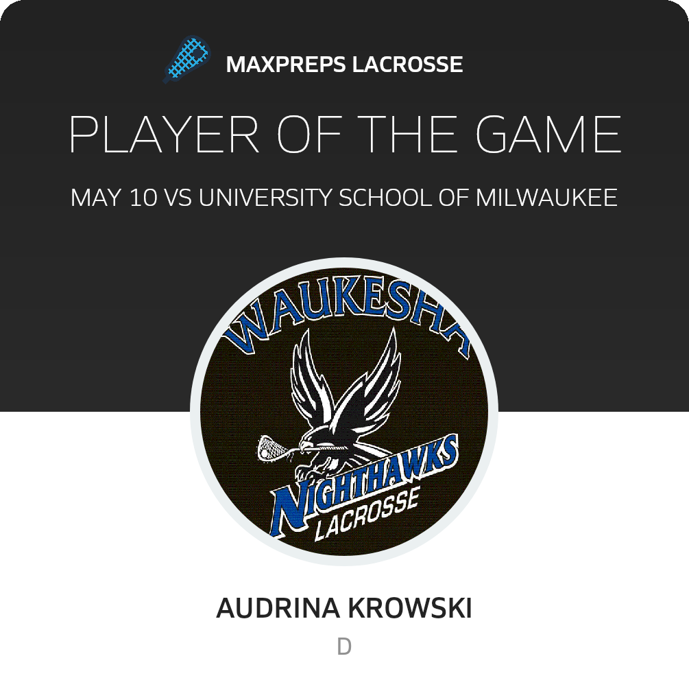 Congratulations to #20 Audrina Krowski for being selected the West/North/South/Catholic Memorial Girls JV Lacrosse Player of the Game.