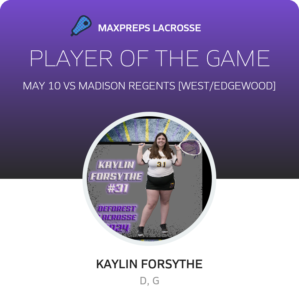 Congratulations to #31 Kaylin Forsythe for being selected the DeForest Girls Lacrosse Player of the Game.