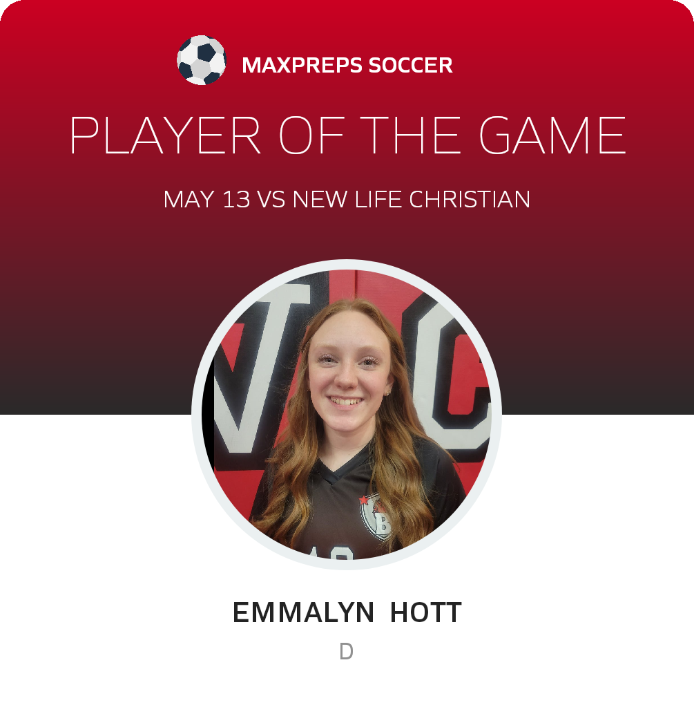Congratulations to #12 Emmalyn Hott for being selected the Cumberland Valley Christian Girls Soccer Player of the Match.
