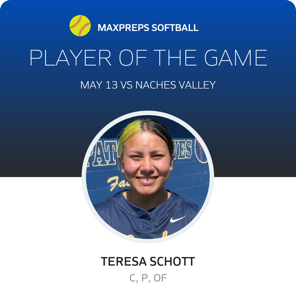 Congratulations to #8 Teresa Schott for being selected the Wapato Softball Player of the Game.