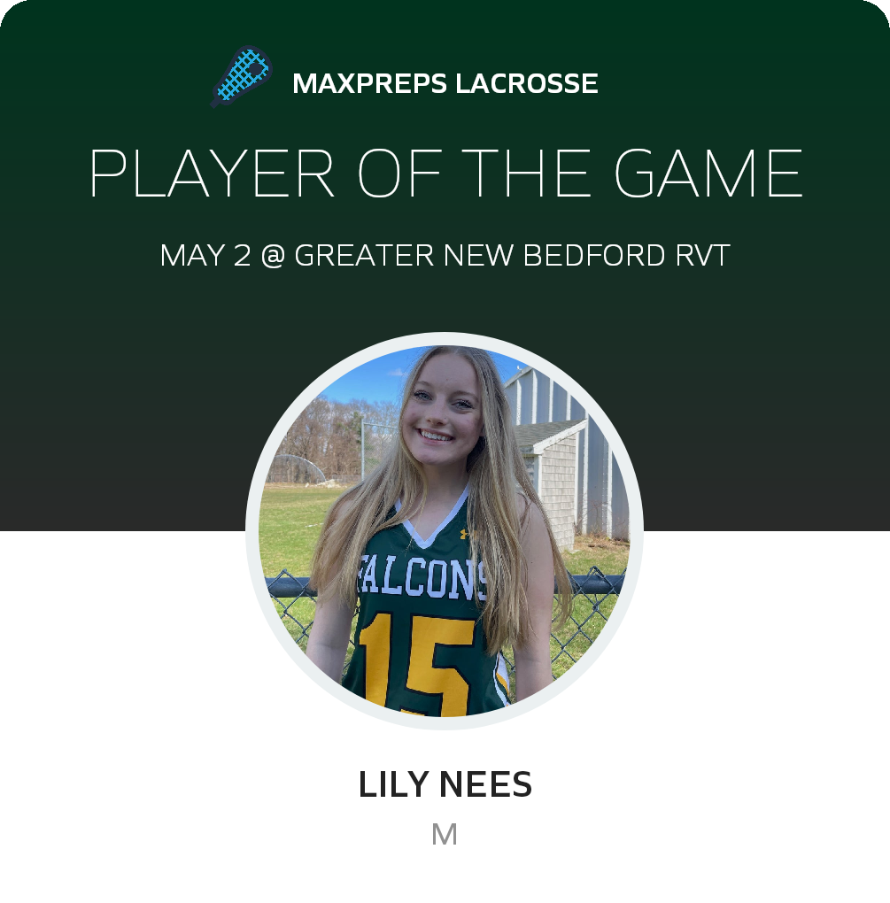 May 2, 2022: New Bedford, MA 02745 Dighton-Rehoboth Regional Falcons (North Dighton, MA) followers exited the stadium in high spirits Monday as they witnessed their lacrosse squad overcome the host Greater New Bedford RVT Bears (New Bedford, MA), 15-8 in a league battle.