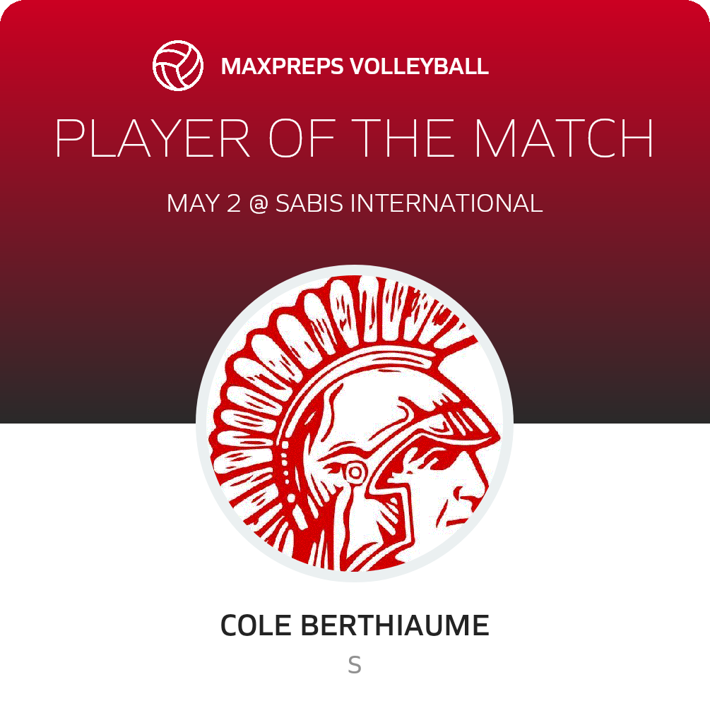 Congratulations to #12 Cole Berthiaume for being selected the East Longmeadow Boys Volleyball Player of the Match.