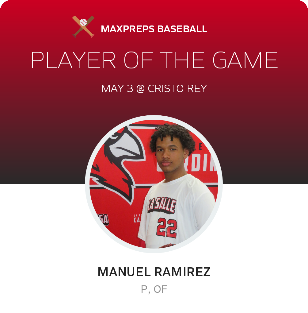 Sophomore Manuel Ramirez got the win with the first No-Hitter of his La Salle career. Ramirez’ final stat line was 5 innings, 0 Hits, 13 strikeouts and 2 walks, that was good enough to earn him the Angry Bird as the Cardinal’s player of the game. On offense, La Salle was led by Damien Maldonado and Alex Dayle who had two hits and two RBIs apiece.