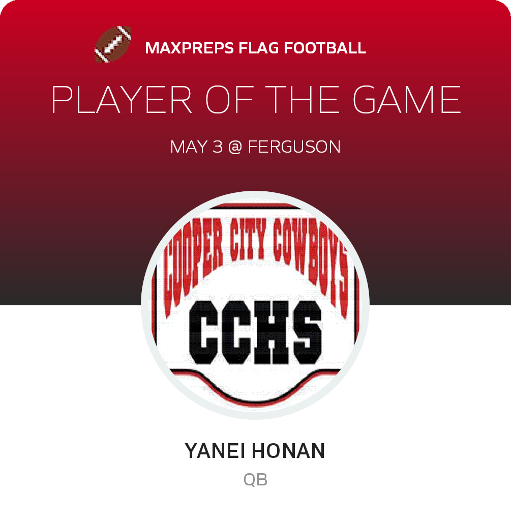Congratulations to #9 Yanei Honan for being selected the Cooper City Girls Flag Football Player of the Game.