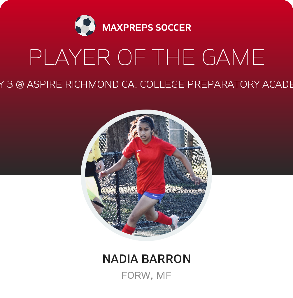 Congratulations to #5 Nadia Barron for being selected the AIMS College Prep Girls Soccer Player of the Match.