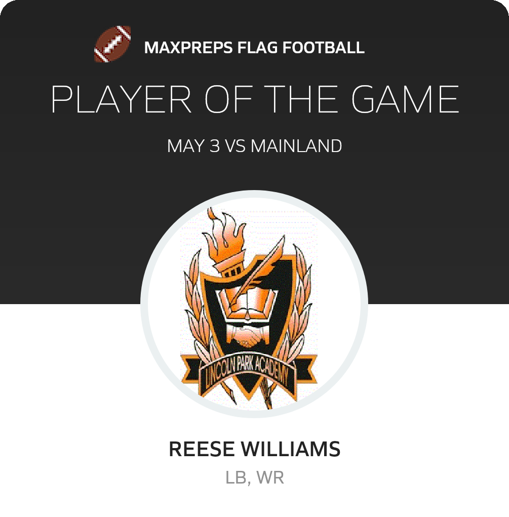 Congratulations to #6 Reese Williams for being selected the Lincoln Park Academy Girls Flag Football Player of the Game.