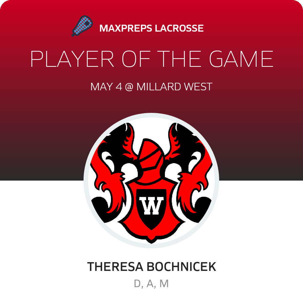 Congratulations to #22 Theresa Bochnicek for being selected the Omaha Westside Girls Lacrosse Player of the Game.