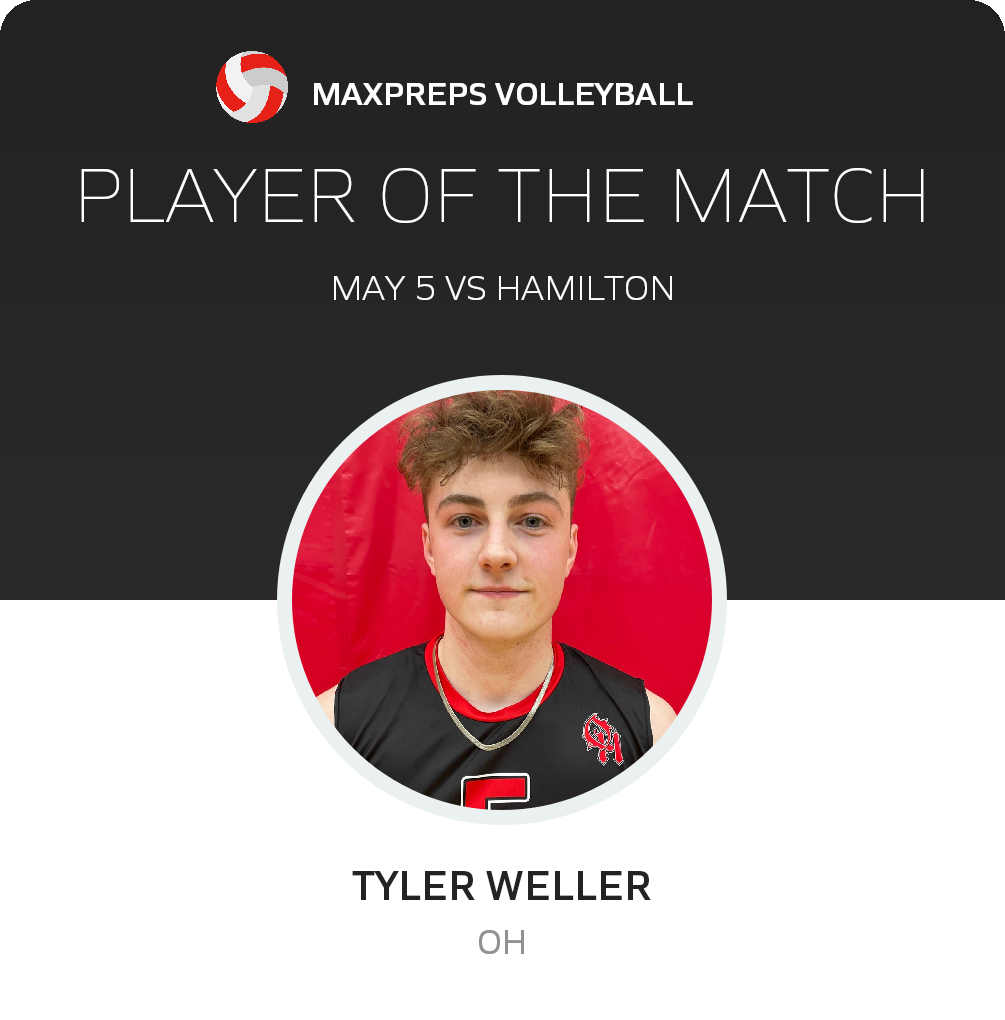 Congratulations to #5 Tyler Weller for being selected the Oak Hills Boys Volleyball Player of the Match.