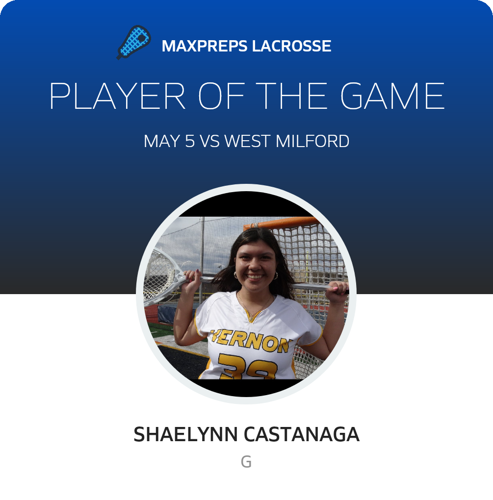 Congratulations to #39 Shaelynn Castanaga for being selected the Vernon Girls Lacrosse Player of the Game.