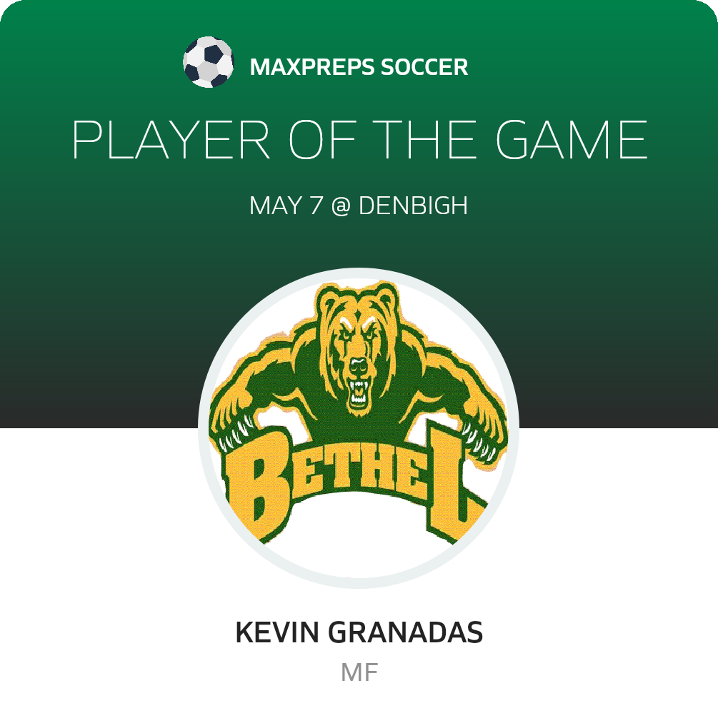 Congratulations to #10 Kevin Granadas for being selected the Bethel Soccer Player of the Match.