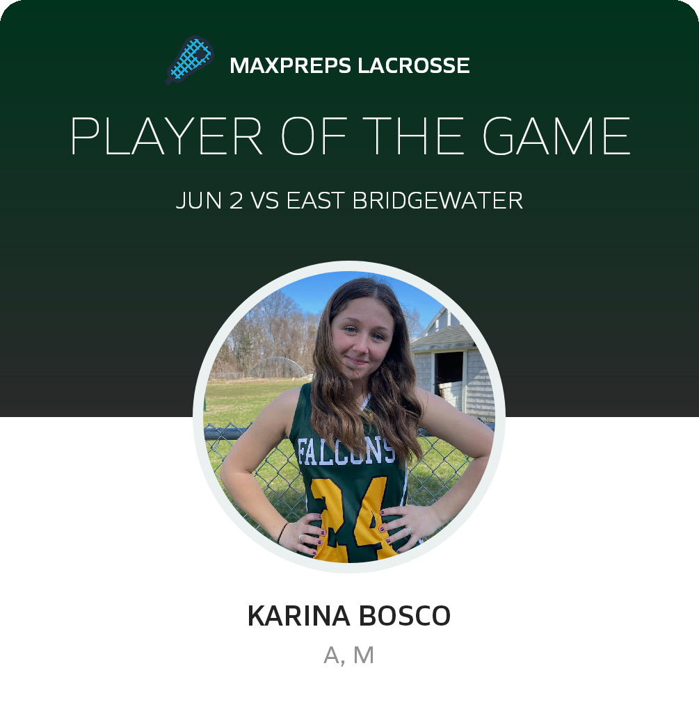 Congratulations to #24 Karina Bosco for being selected the Dighton-Rehoboth Regional Girls Lacrosse Player of the Game.