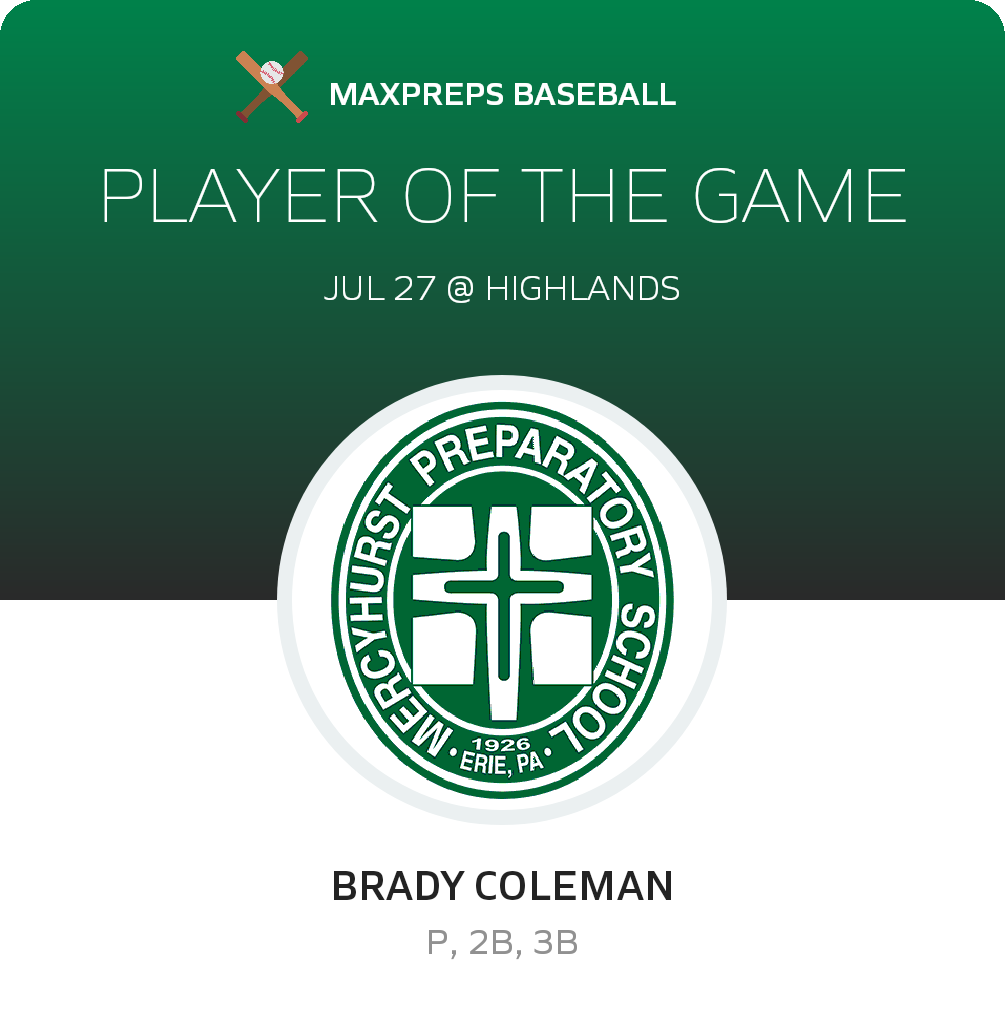 Congratulations to #3 Brady Coleman for being selected the Mercyhurst Prep Freshman Baseball Player of the Game.