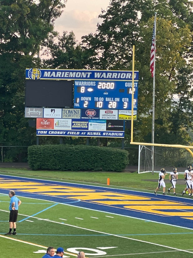 August 18, 2023: Cincinnati, OH 45227 Mariemont Warriors (Cincinnati, OH) fans left the game satisfied Friday as they observed their football team nudge the visiting Oakwood Lumberjacks (Dayton, OH), 22-19 in a non-league test.
