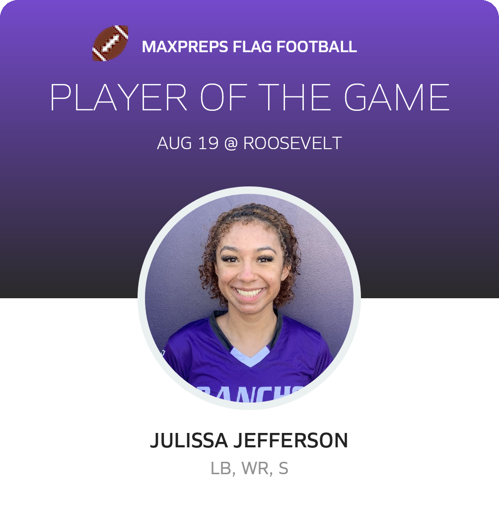Congratulations to #10 Julissa Jefferson for being selected the Rancho Cucamonga Girls Flag Football Player of the Game.