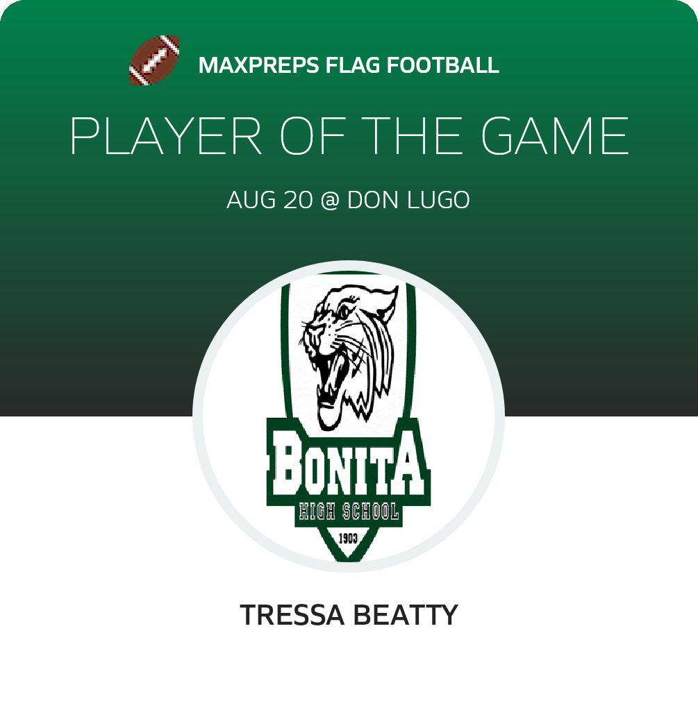 Congratulations to #5 Tressa Beatty for being selected the Bonita Girls Flag Football Player of the Game.