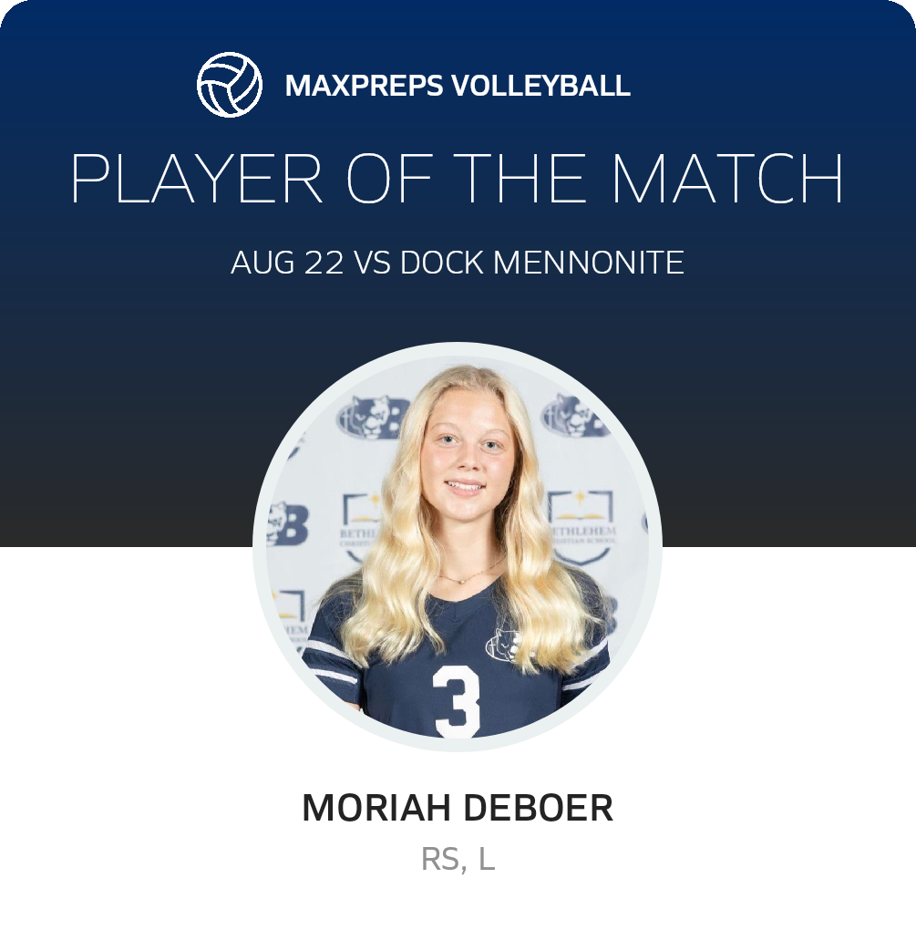 Congratulations to #3 Moriah deBoer for being selected the Bethlehem Christian Volleyball Player of the Match.