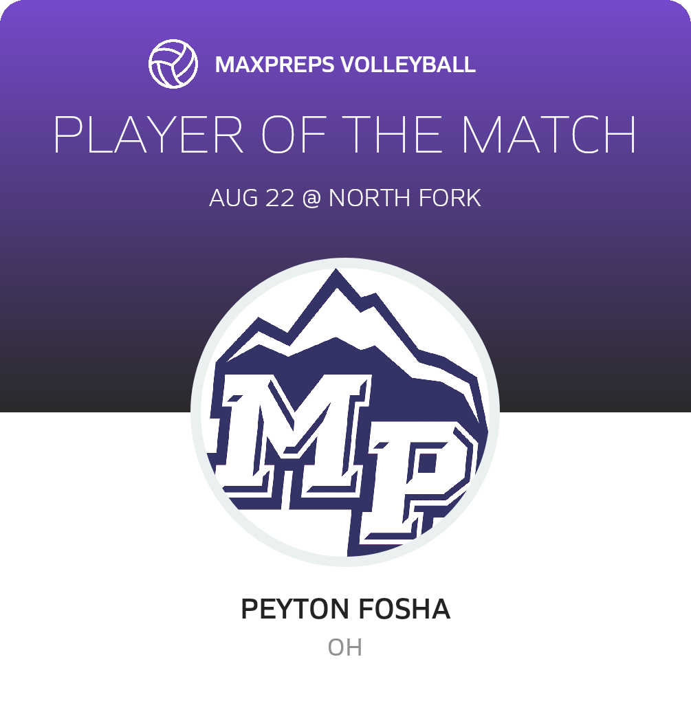 Congratulations to #12 Peyton Fosha for being selected the Middle Park Volleyball Player of the Match.