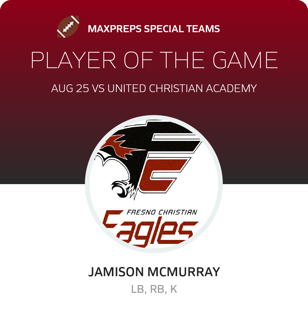 With the win, Fresno Christian improves its record to 2-0 on the season. The Eagles travel to Branson (Ross, CA) to confront the Bulls in a non-league test on Saturday, September 2. The Bulls go into the test with a record of 0-0.