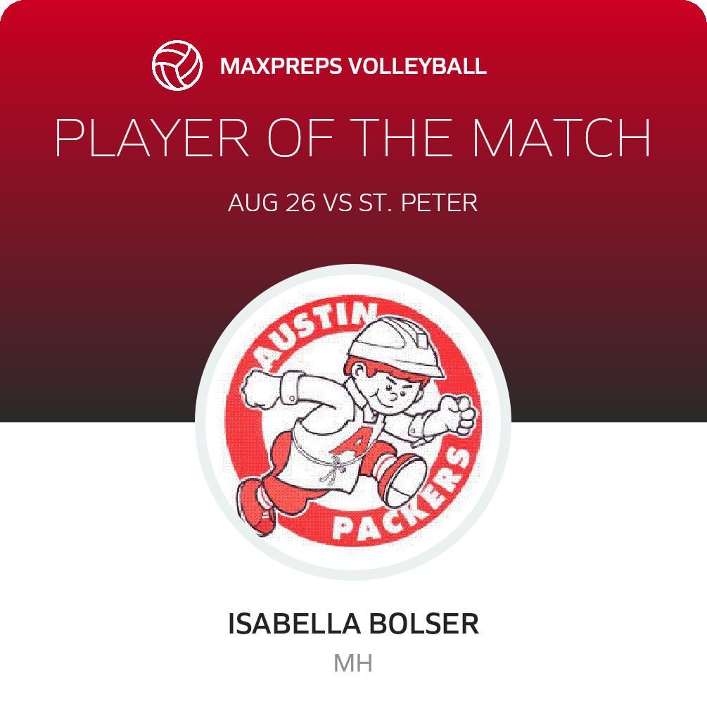 August 26, 2025: Austin, MN 55912 Austin Packers (Austin, MN) boosters left the game satisfied Tuesday as they saw their volleyball squad edge the visiting St. Peter Saints (St. Peter, MN), 3-2 in a non-league test.