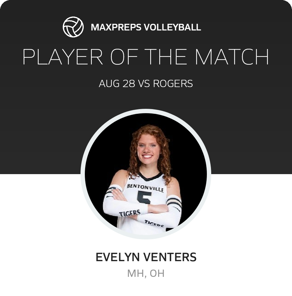 August 28, 2025: Bentonville, AR 72712 Bentonville Tigers (Bentonville, AR) followers left the game satisfied Thursday as they saw their volleyball squad achieve victory over the visiting Rogers Mountaineers (Rogers, AR), 3-0 in a league outing.