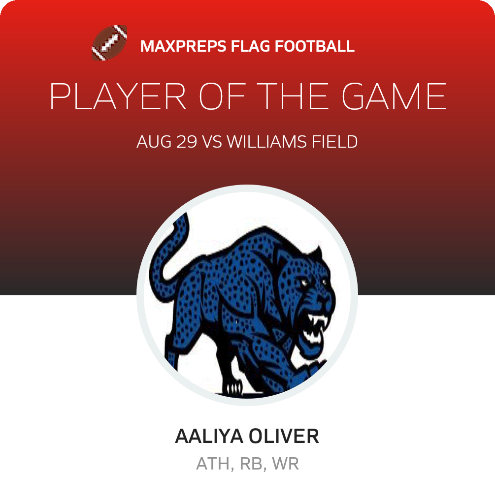 Congratulations to #22 Olivia Brannock for being selected the Williams Field Girls Flag Football Player of the Game.