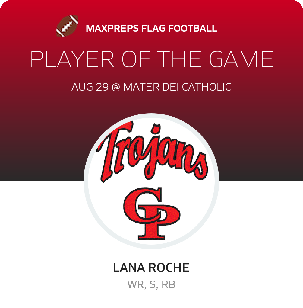 Congratulations to #1 LANA ROCHE for being selected the Castle Park Girls Flag Football Player of the Game.