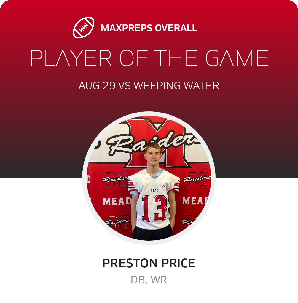 August 29, 2025: Mead, NE 68041 Mead Raiders (Mead, NE) followers went home pleased Friday as they saw their football team gain a win over the visiting Weeping Water Indians (Weeping Water, NE), 22-14 in a non-league battle.
