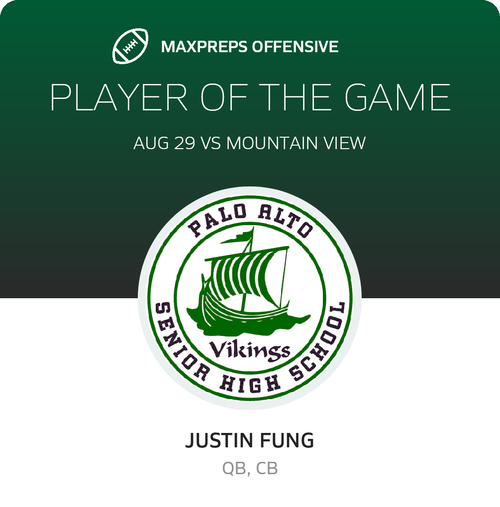 August 29, 2025: Palo Alto, CA 94301 In Friday's non-league game, the Mountain View Spartans (Mountain View, CA) football team edged the host Palo Alto Vikings (Palo Alto, CA), by a tally of 46-44.