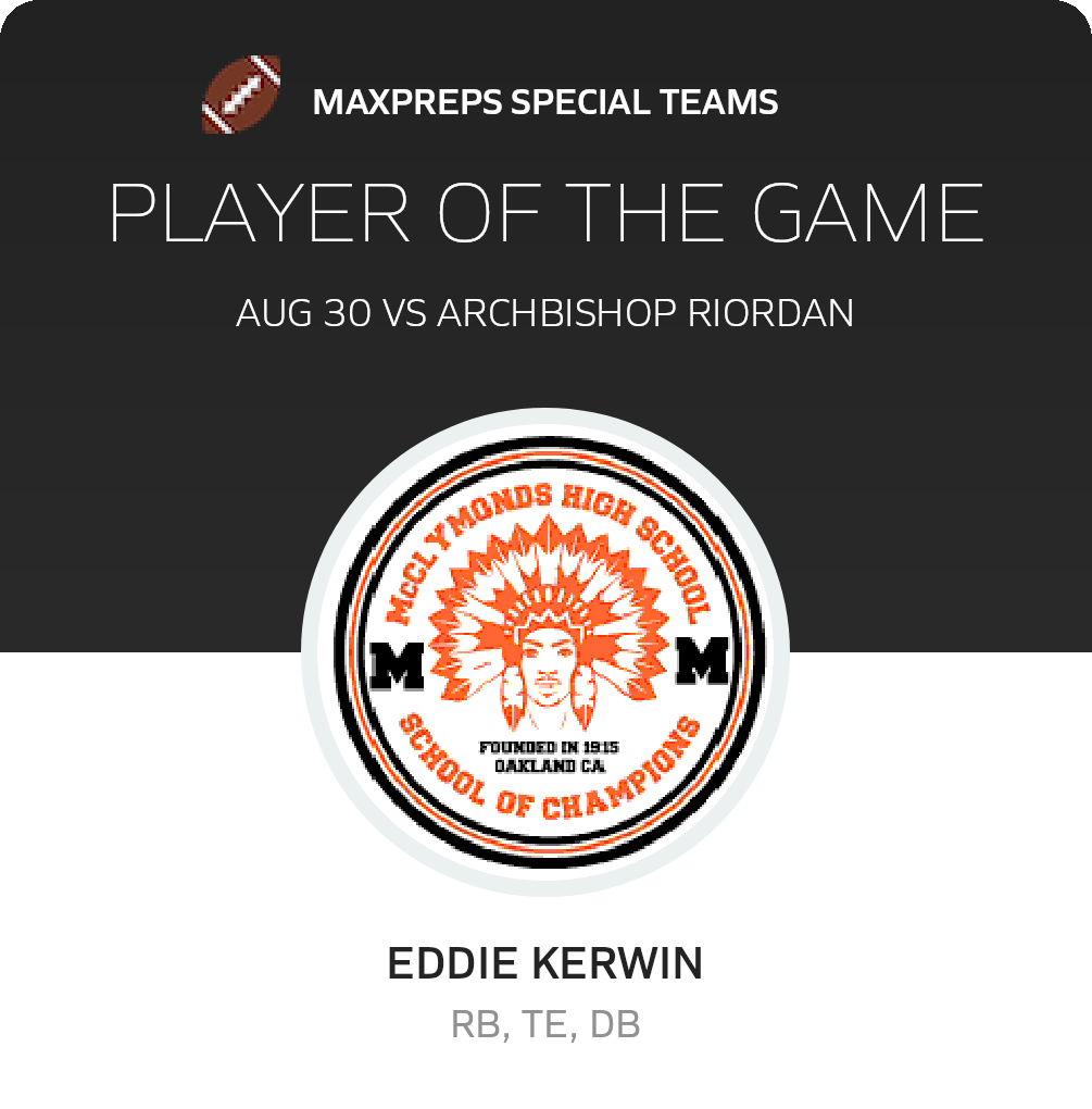 Congratulations to #20 Eddie Kerwin for being selected the Overall, Offensive, Defensive and Special Teams McClymonds JV Football Player of the Game.
