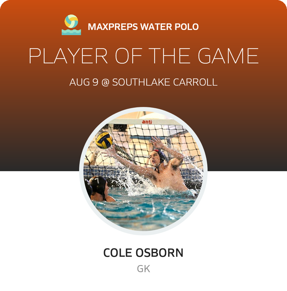 Congratulations to #1 Cole Osborn for being selected the Round Rock Westwood Water Polo Player of the Game.