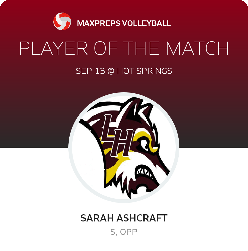 Congratulations to #10 Sarah Ashcraft for being selected the Lake Hamilton JV Volleyball Player of the Match.