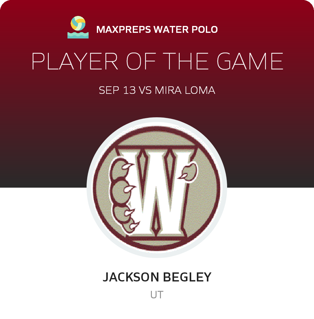 Congratulations to #13 Jackson Begley for being selected the Whitney JV Water Polo Player of the Game.