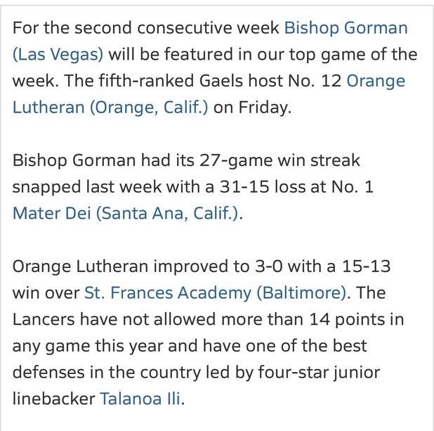 Nevada High School Football - Bishop Gorman winner over Orange Lutheran