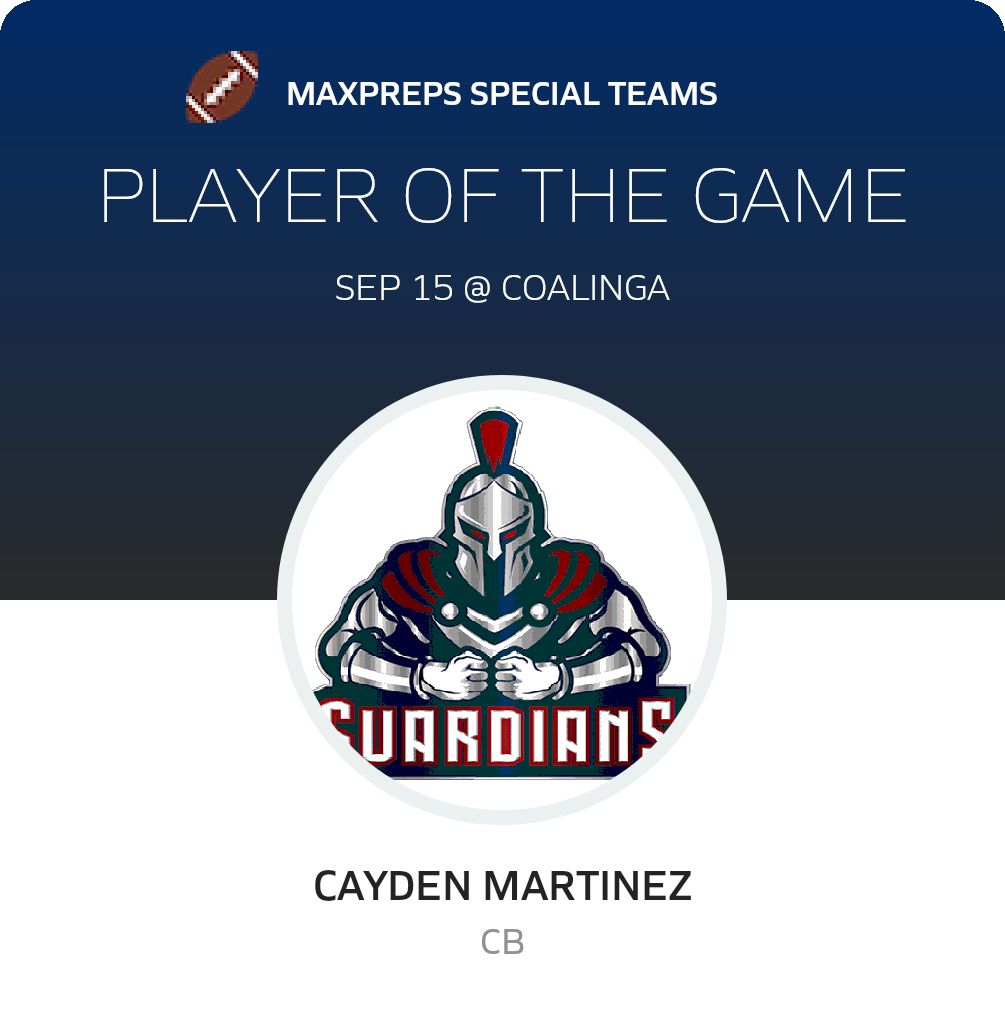 In their next game, the Guardians face the Sanger Apaches (Sanger, CA) in a bout, on Friday, September 29. Justin Garza will attempt to advance on its 5-0 season record. The Apaches enter the bout with a 0-5 record after their 34-0 non-league loss to Centennial (Bakersfield, CA).