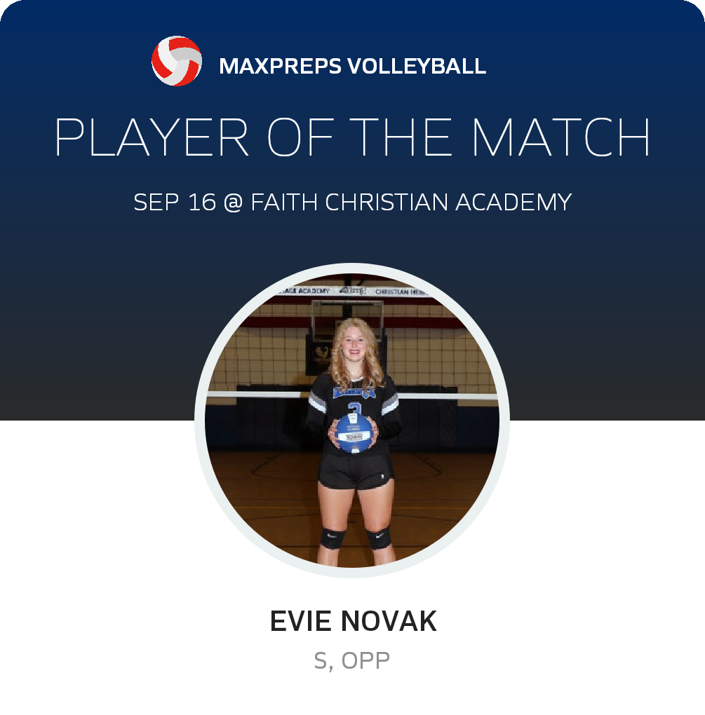 Congratulations to #03 Evie Novak for being selected the Christian Heritage Academy Volleyball Player of the Match.