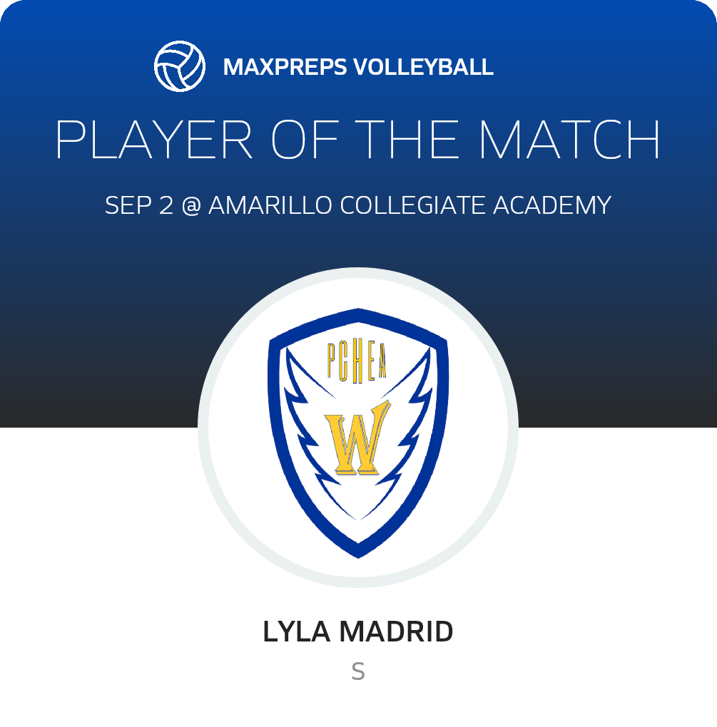 Congratulations to #18 Lyla Madrid for being selected the Panhandle Christian Home Educators Volleyball Player of the Match.