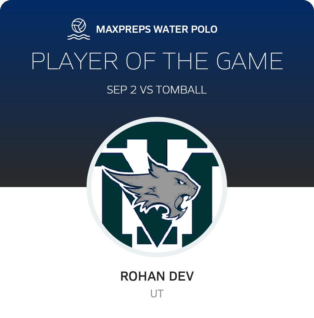 Congratulations to #8 ROHAN DEV for being selected the Tomball Memorial Water Polo Player of the Game.