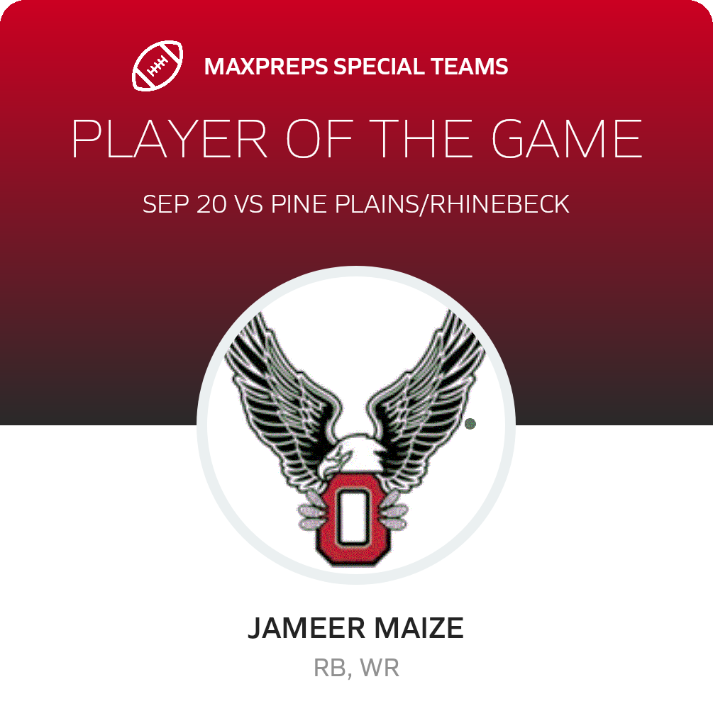 Congratulations to #13 Chase Matteson (overall and defensive) and #24 Jameer Maize (offensive and special teams) for being selected the Onteora Football Players of the Game.