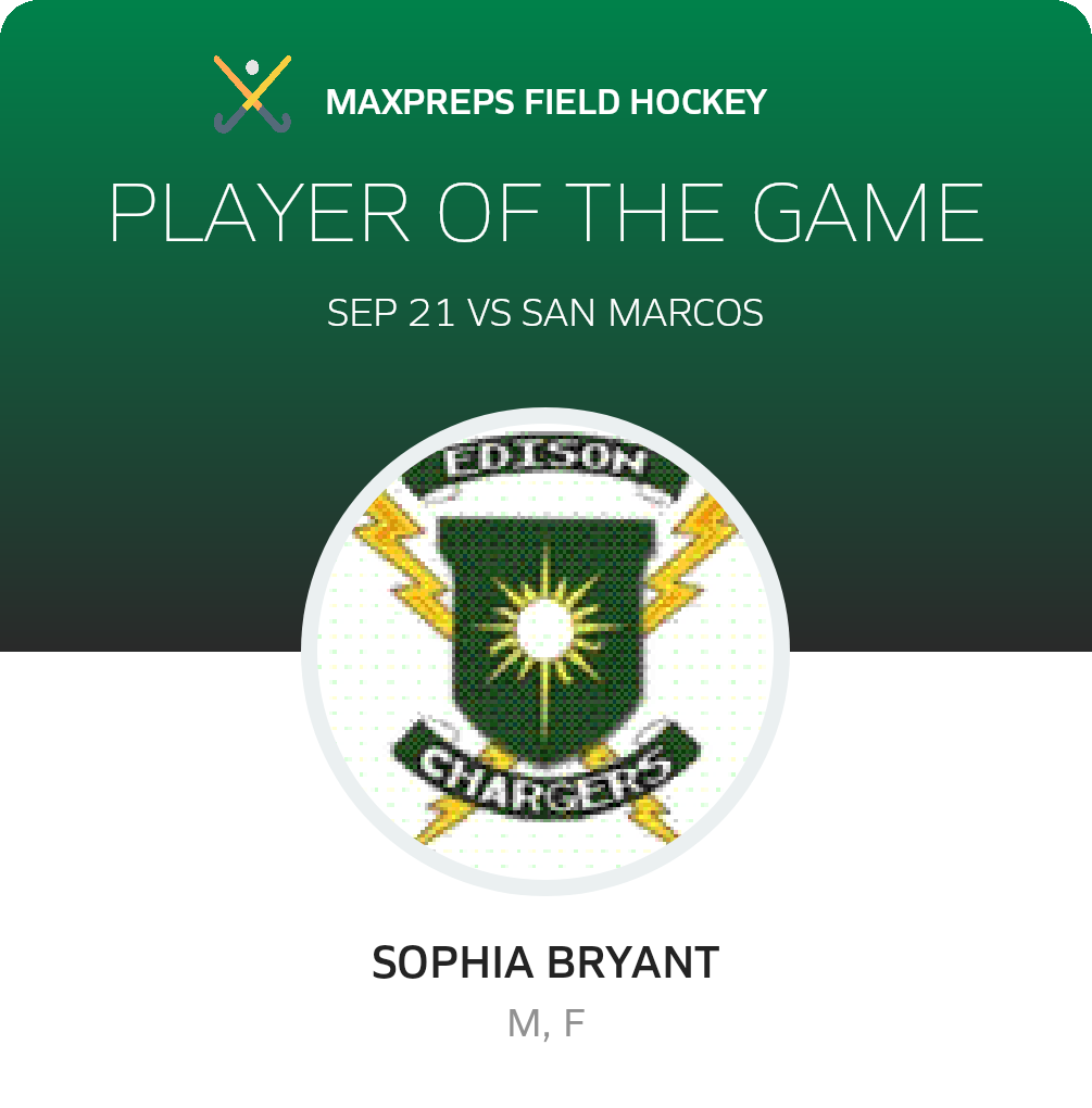 Congratulations to #15 Sophia Bryant for being selected the Edison Field Hockey Player of the Game.