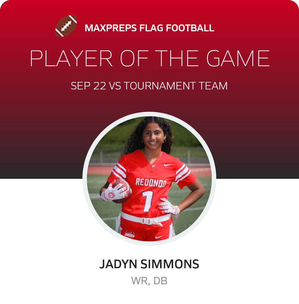 Congratulations to #1 Jadyn Simmons for being selected the Redondo Union Girls Flag Football Player of the Game.