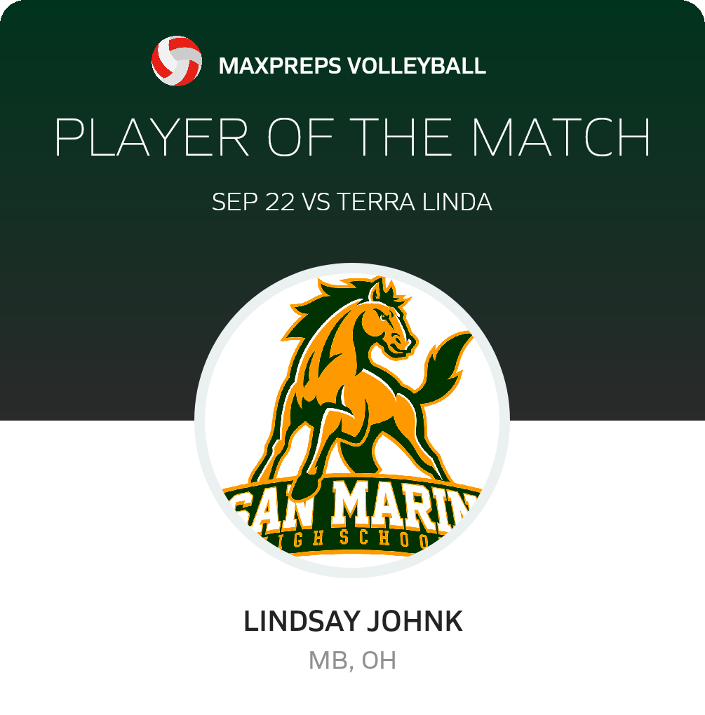 September 22, 2023: Novato, CA 94945 The San Marin Mustangs volleyball team scored 3 points and limited the visiting Terra Linda Trojans to 1 in the Mustangs league victory on Friday.