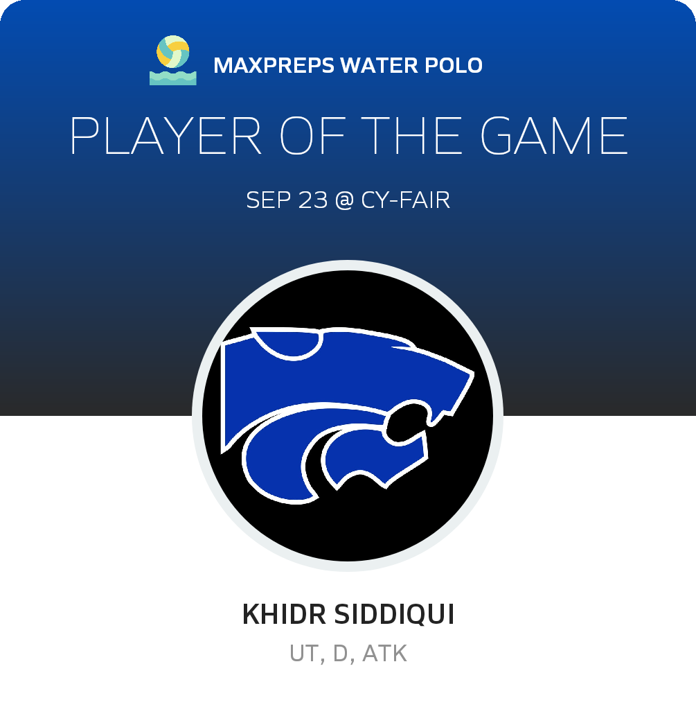 Congratulations to #7 Khidr Siddiqui for being selected the Cypress Creek Water Polo Player of the Game.