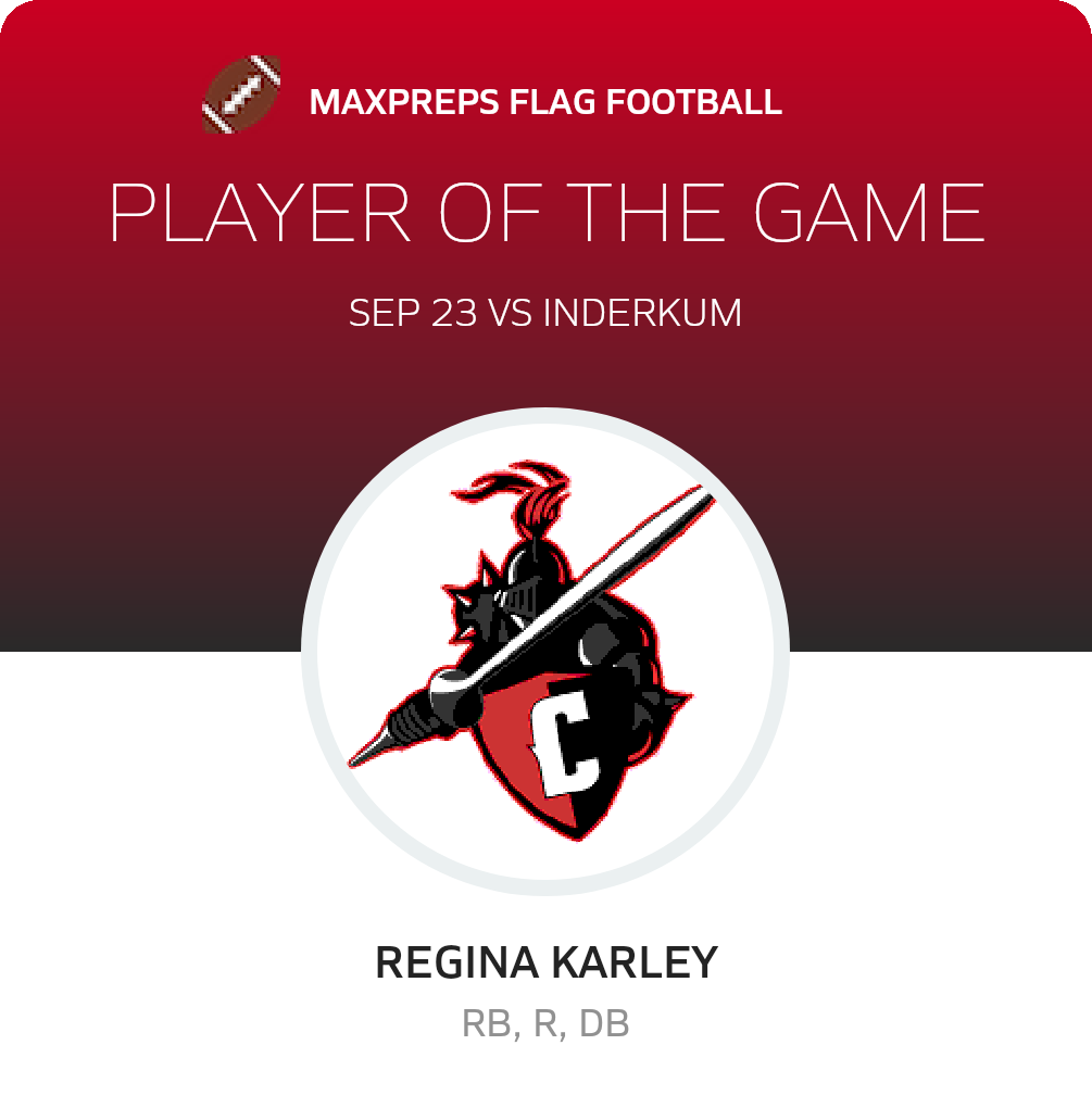 Congratulations to #18 Regina Karley for being selected the Cordova Girls Flag Football Player of the Game.