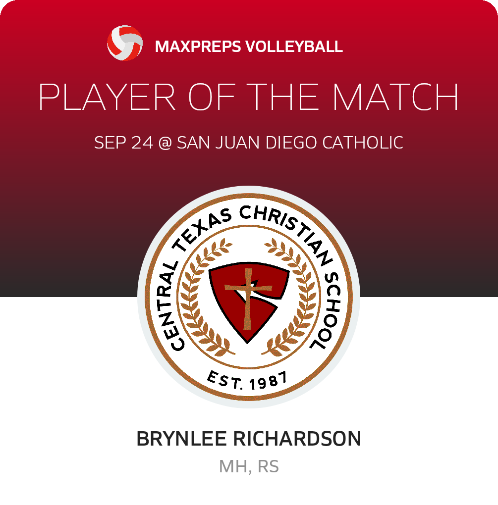 Congratulations to #21 Brynlee Richardson for being selected the Central Texas Christian Volleyball Player of the Match.