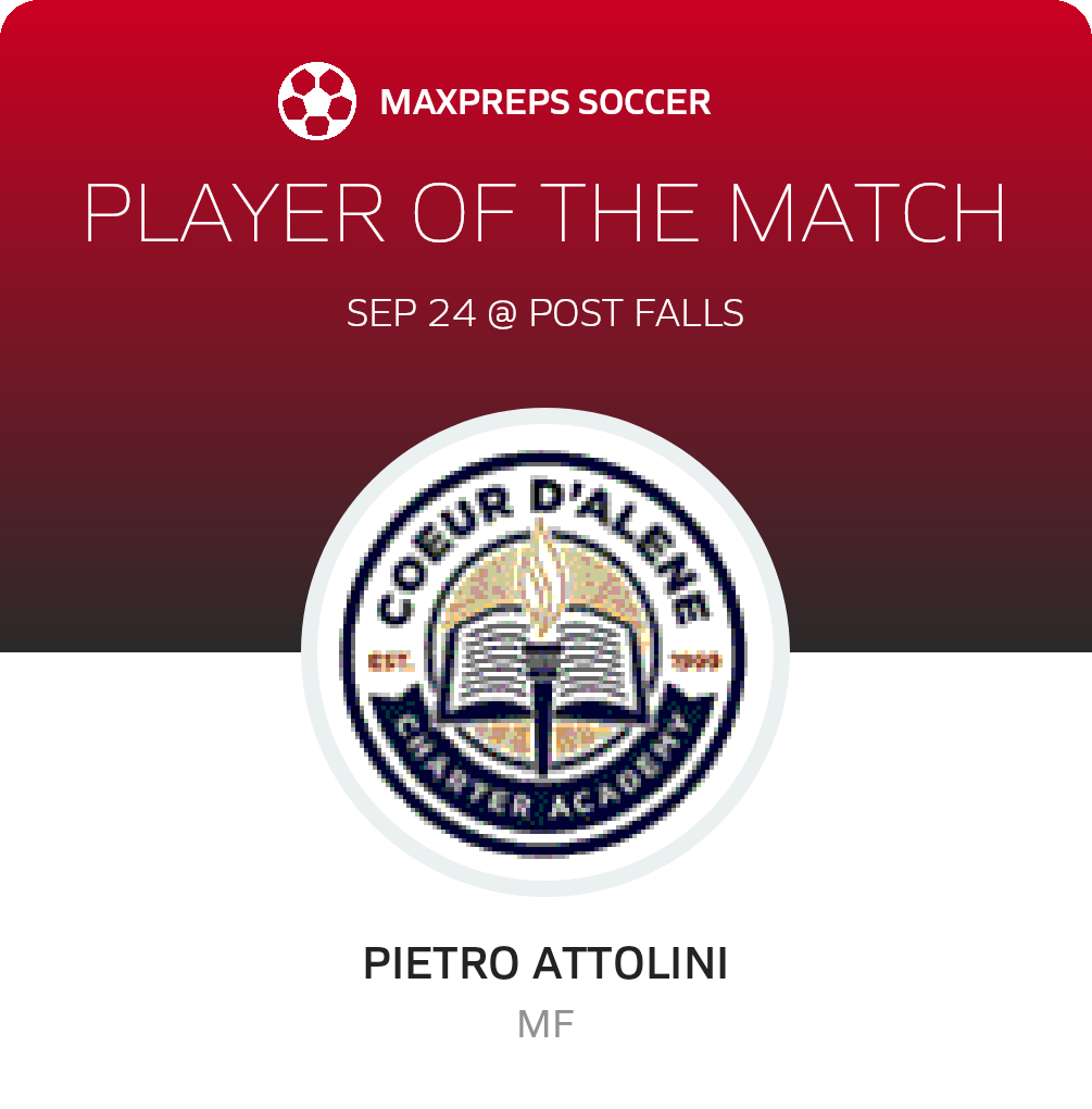 Congratulations to #8 Pietro Attolini for being selected the Coeur d'Alene Charter Academy Soccer Player of the Match.