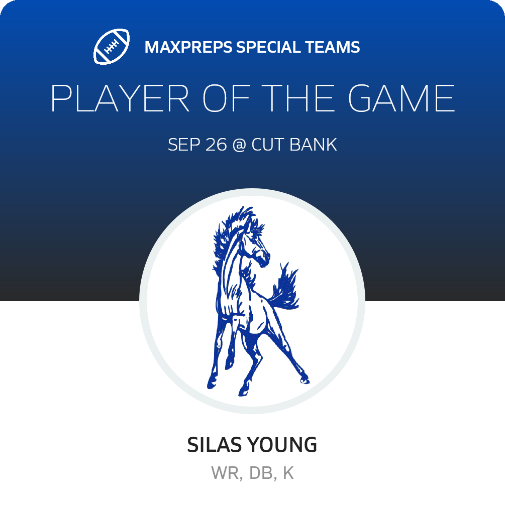 Congratulations to #5 Kazner Oxarart (offensive), #32 Thatcher Marquis (defensive) and #20 Silas Young (special teams) for being selected the Malta/Whitewater/Saco/Dodson Football Players of the Game.